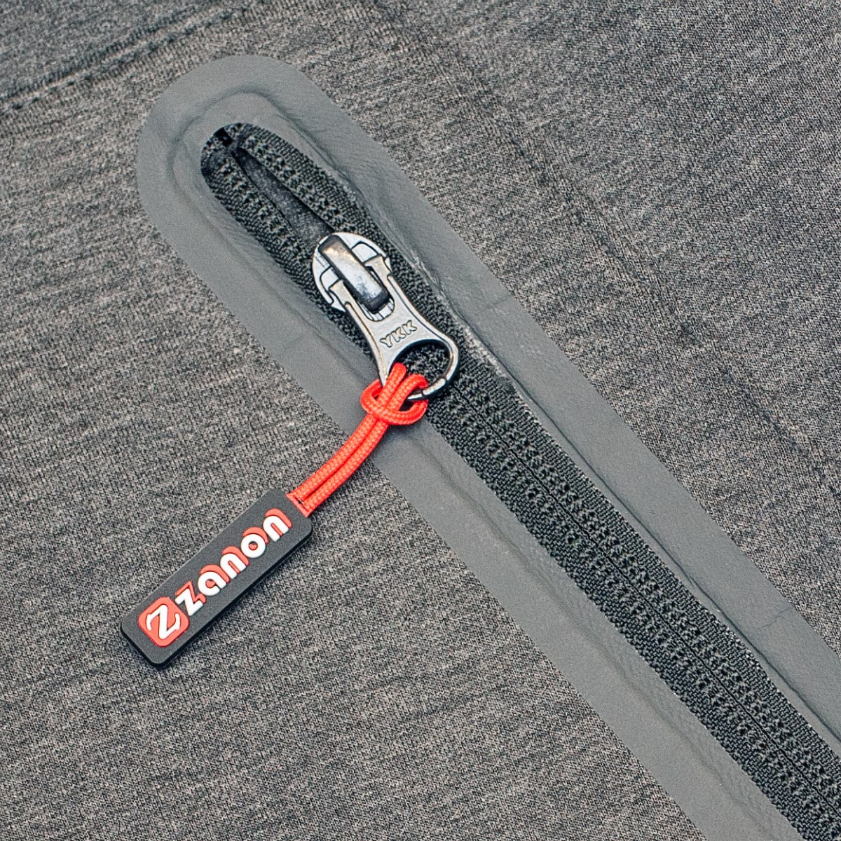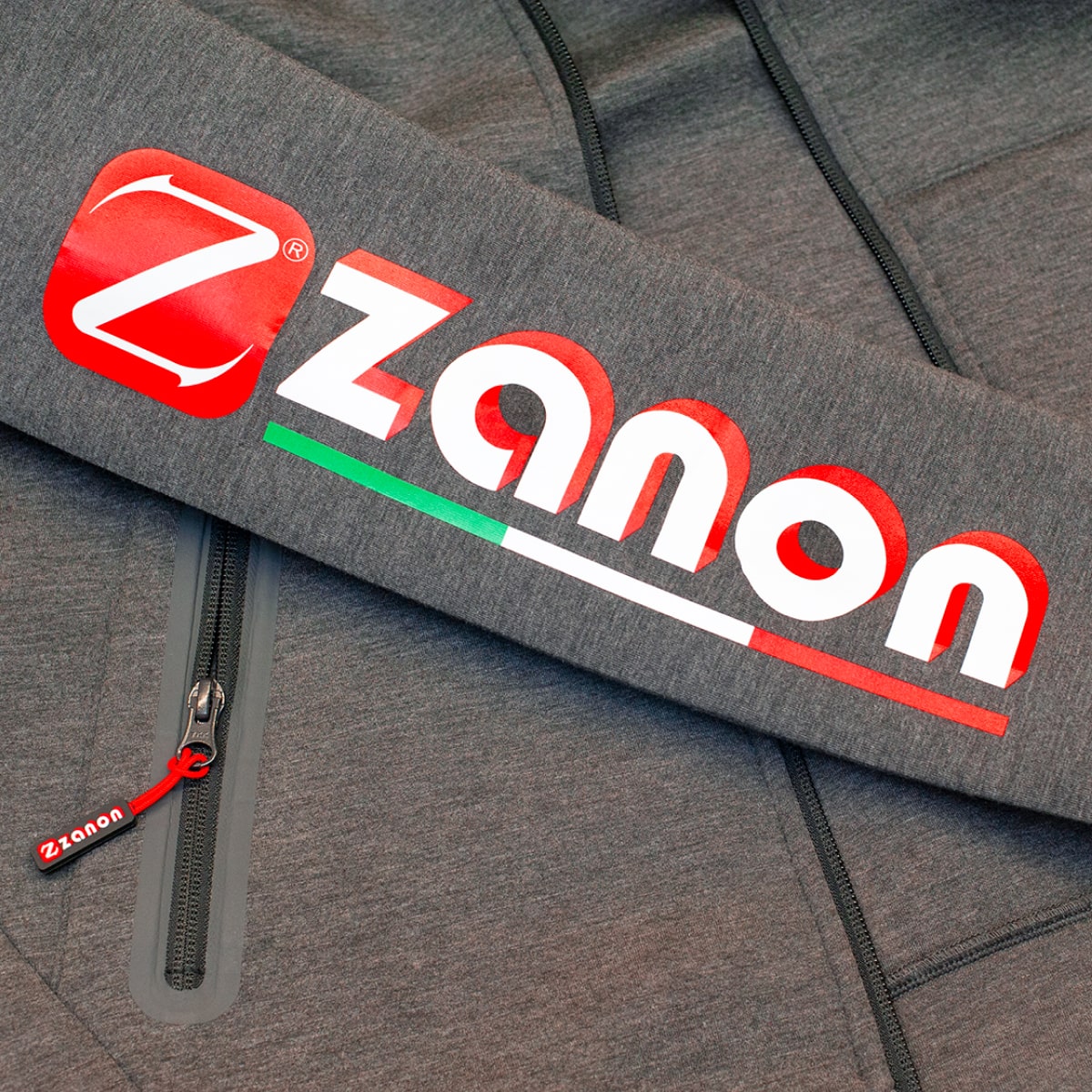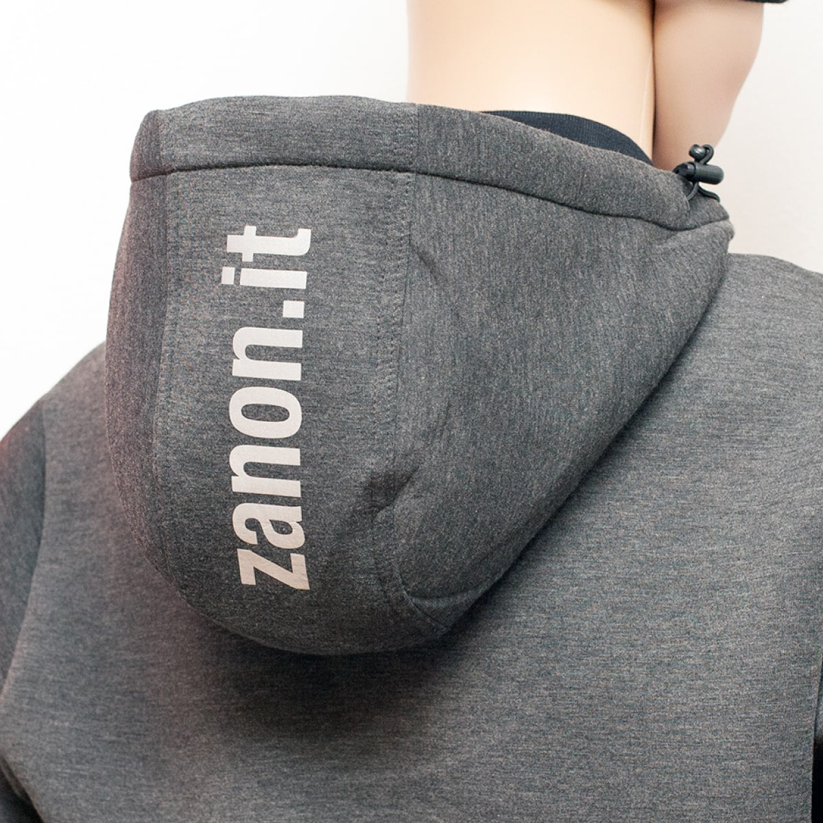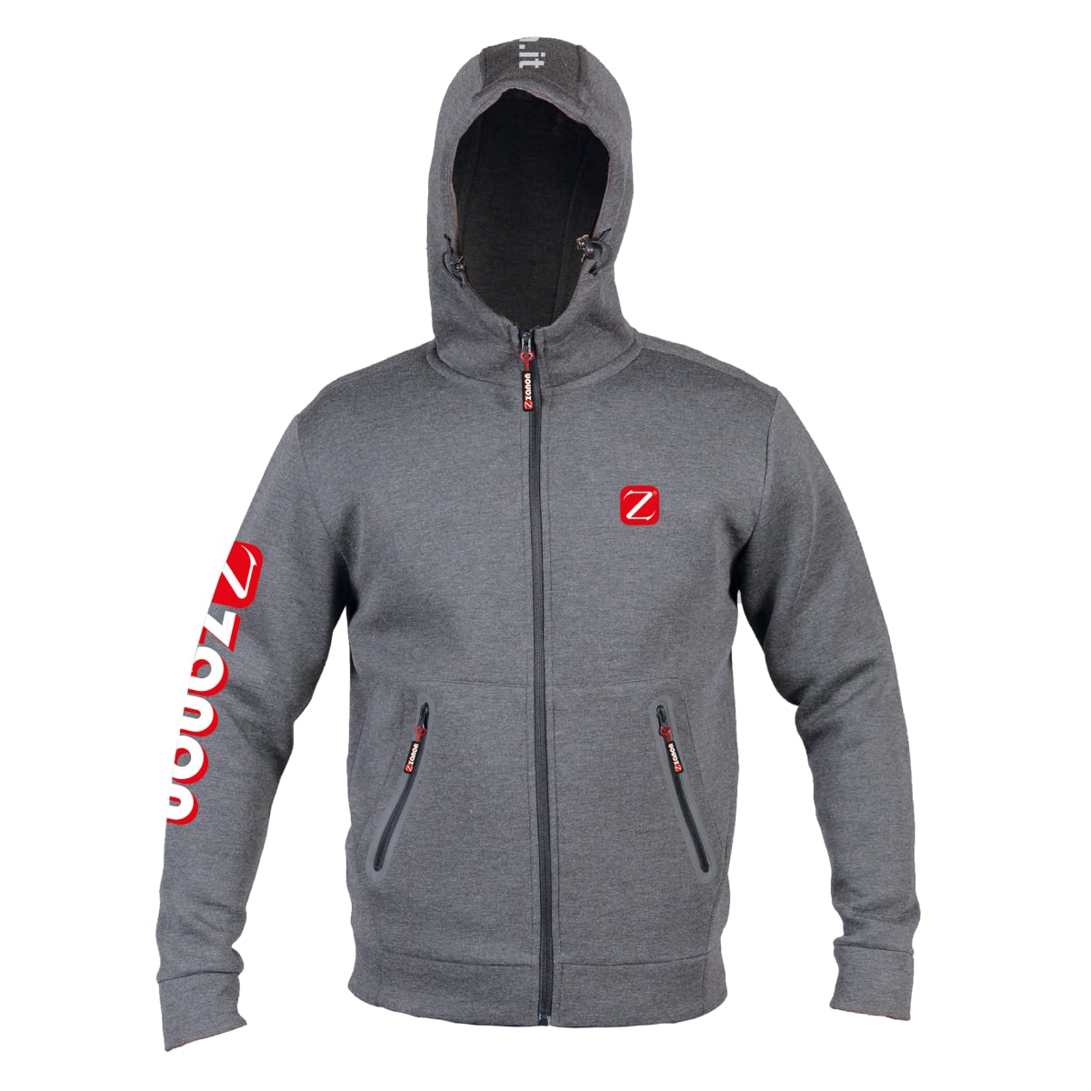 Unpadded scuba jacket with drawstring hood, pouch pocket, and two zips. Contrasting inner neck ribbon